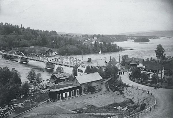 Bergeforsens landsvägsbro samt bebyggelse. Taget från södra sidan. Vykort.