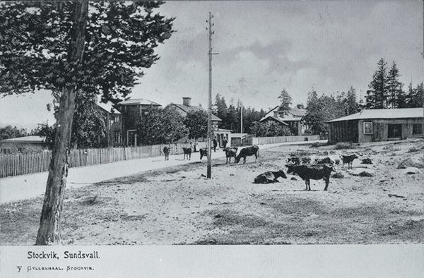 Vy från Stockvik med landsväg, ett flertal kor samt bostadsbebyggelse. Bildtext till vykortet "Stockvik, Sundsvall. V Gyllenhall Stockvik".