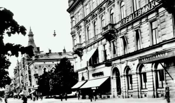 Sundsvalls Kreditbank. Till vänster en del av kvarteret Försöket och till höger en del av kvarteret Olympen. Text på vykortet "Sundsvall. Storgatan".