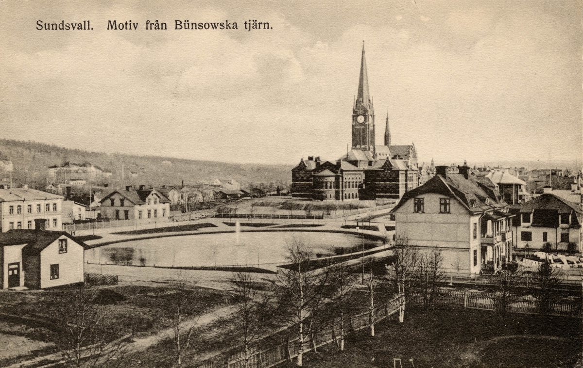 Vykort. Villabebyggelsen kring Bünsowska tjärnen, Västermalm med Sundsvalls kyrka fr väster.