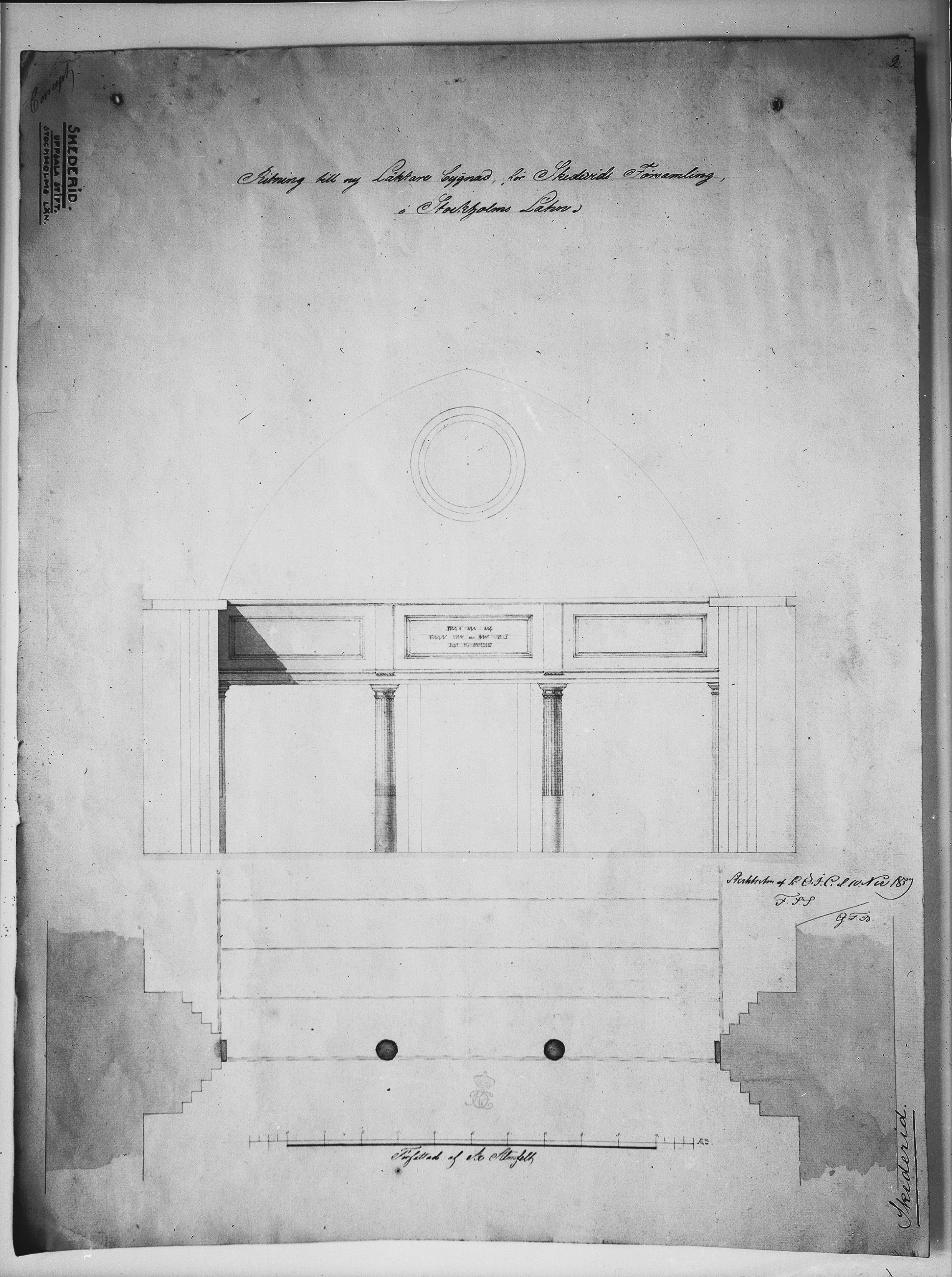 Ritning till ny läktarbyggnad av A. Almfelt 1829. Avfotografering efter original i Kgl. Byggnadsstyrelsens arkiv.