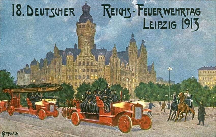 Tyska Rikets brandkår, Leipzig 1913. Vykort. Tecknat motiv. Privata bilder från brandchefen för Sundsvalls brandkår Gustaf Hellgren och hans familj.