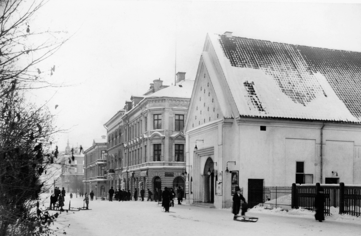 Vintervy med sparkåkande människor efter Esplanaden. Sveabiografen till höger.