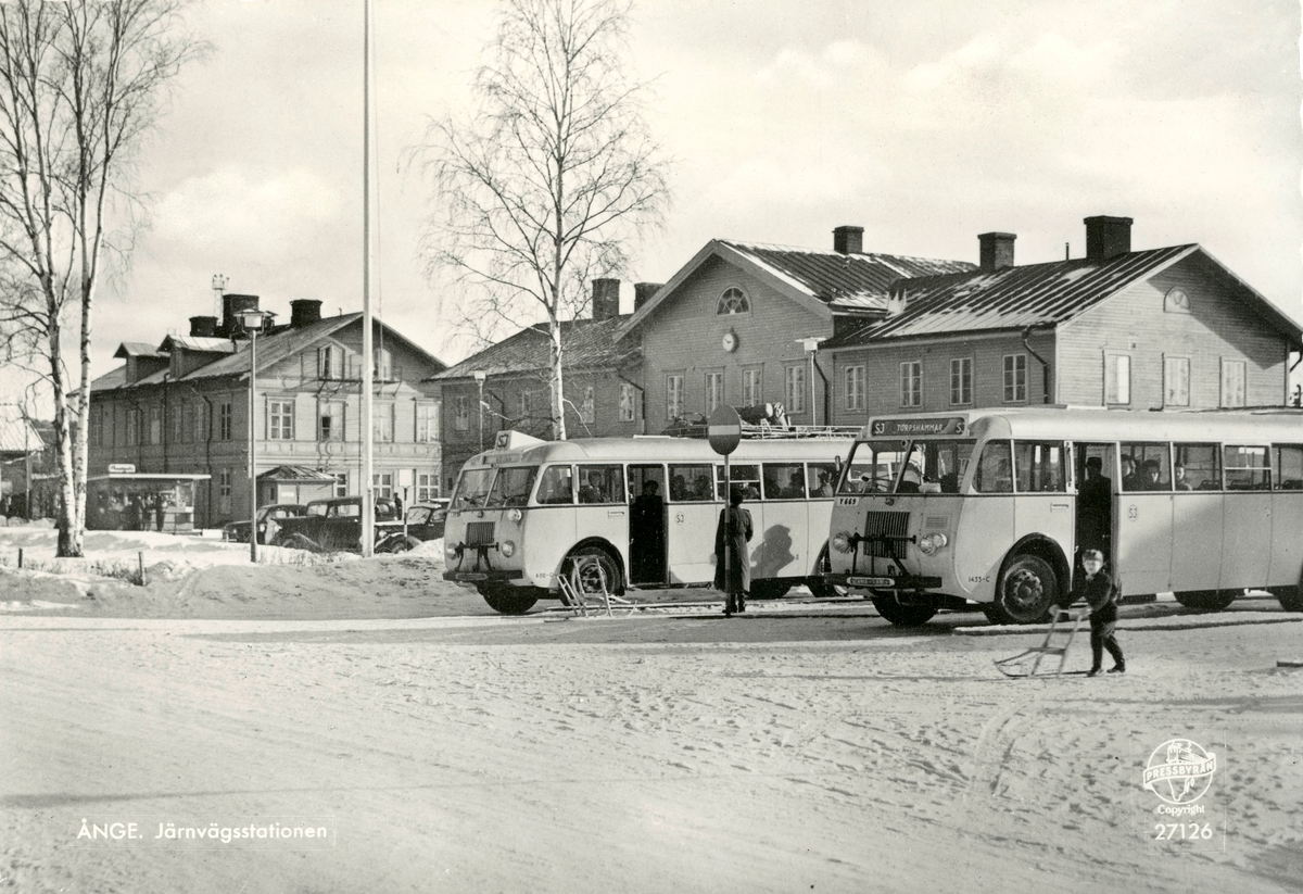 Ånge järnvägsstation. Anslutningsbussar står framför stationen. Vykort.