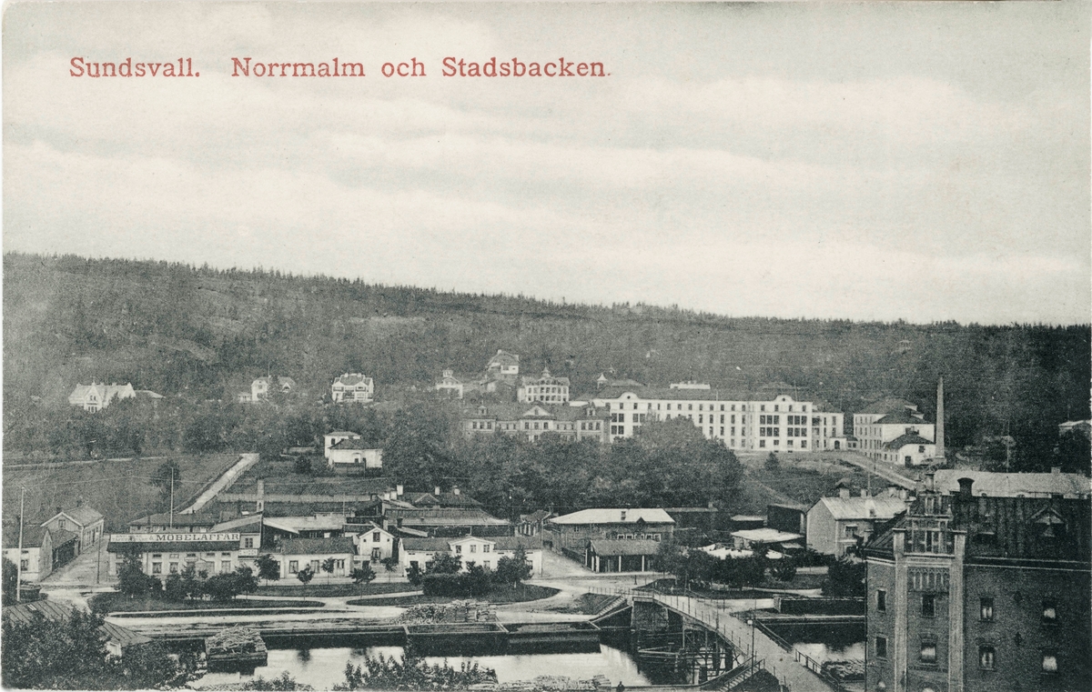 Vy över Norrmalm. Gamla gångbron (kallad Puckelbron och Kamelryggen) över Selångersån. Bron raserades vid vårfloden 1919. Lasarettet och stadsbacken. Hydéns möbelaffär ses till vänster efter Skepparegatan. Ett av varumagasinen i nedre höger kant. Vykort.