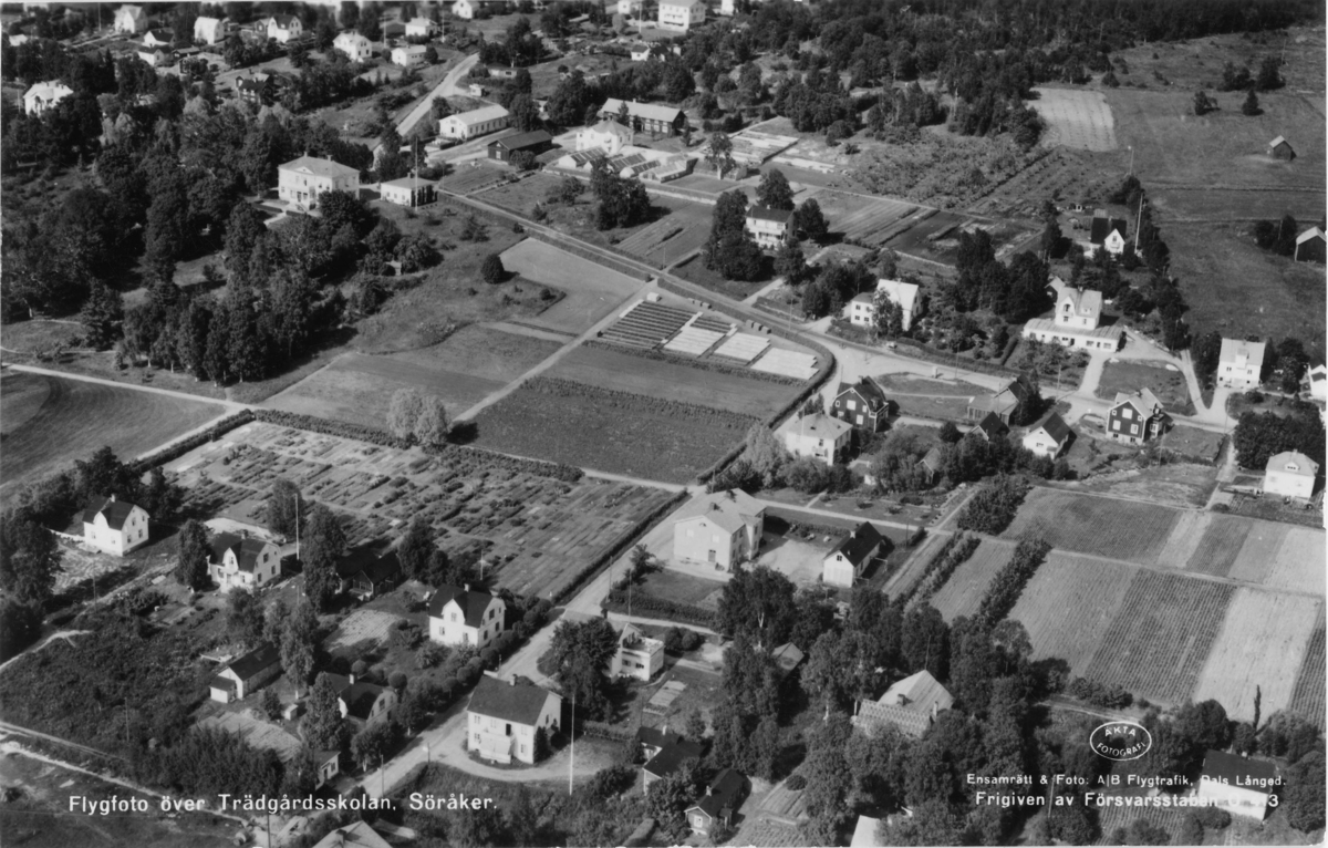 Flygbild över Söråkers trädgårdsskola med omgivningar. Vykort.