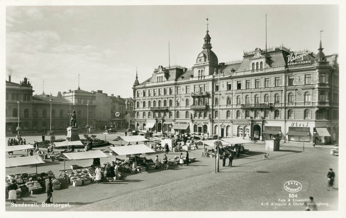 Stora Torget, Stadshuset samt Hirschska huset till höger, Sundsvall.
