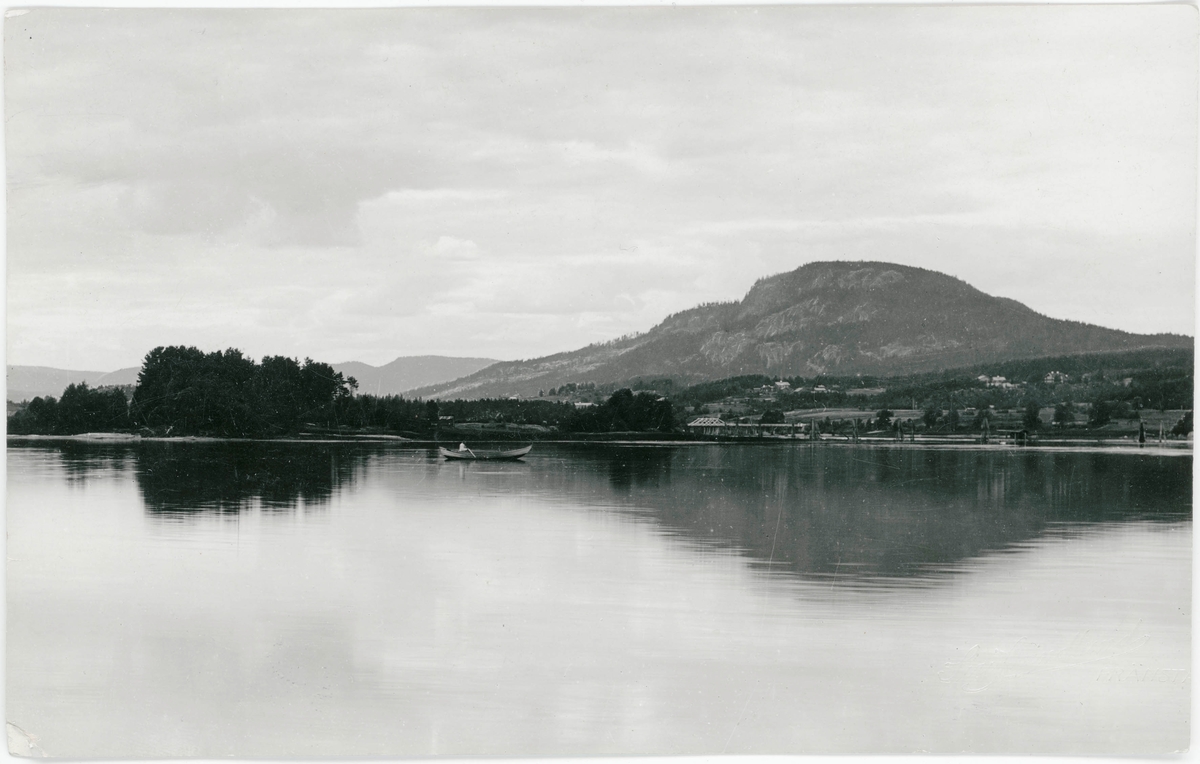 Getberget med Ljungan i förgrunden. Man med båt. Vykort.