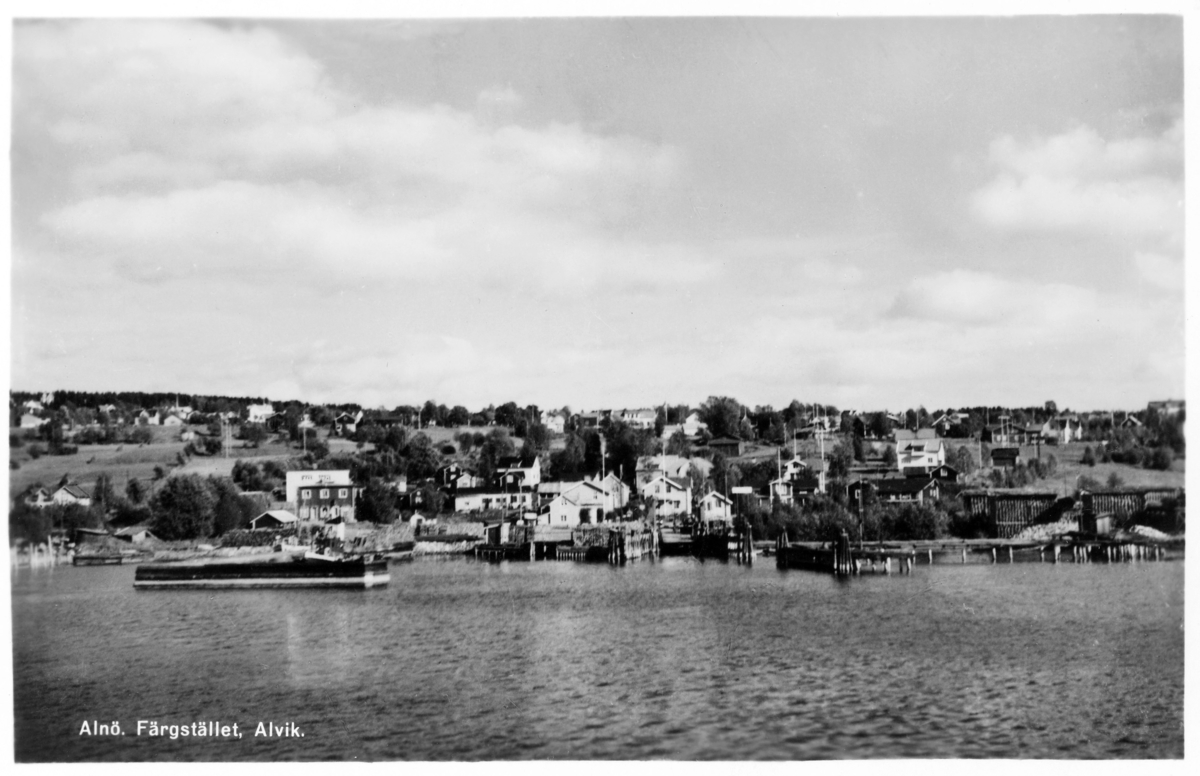 Vy med Alviks färjeläge, Alnö. Vykort.