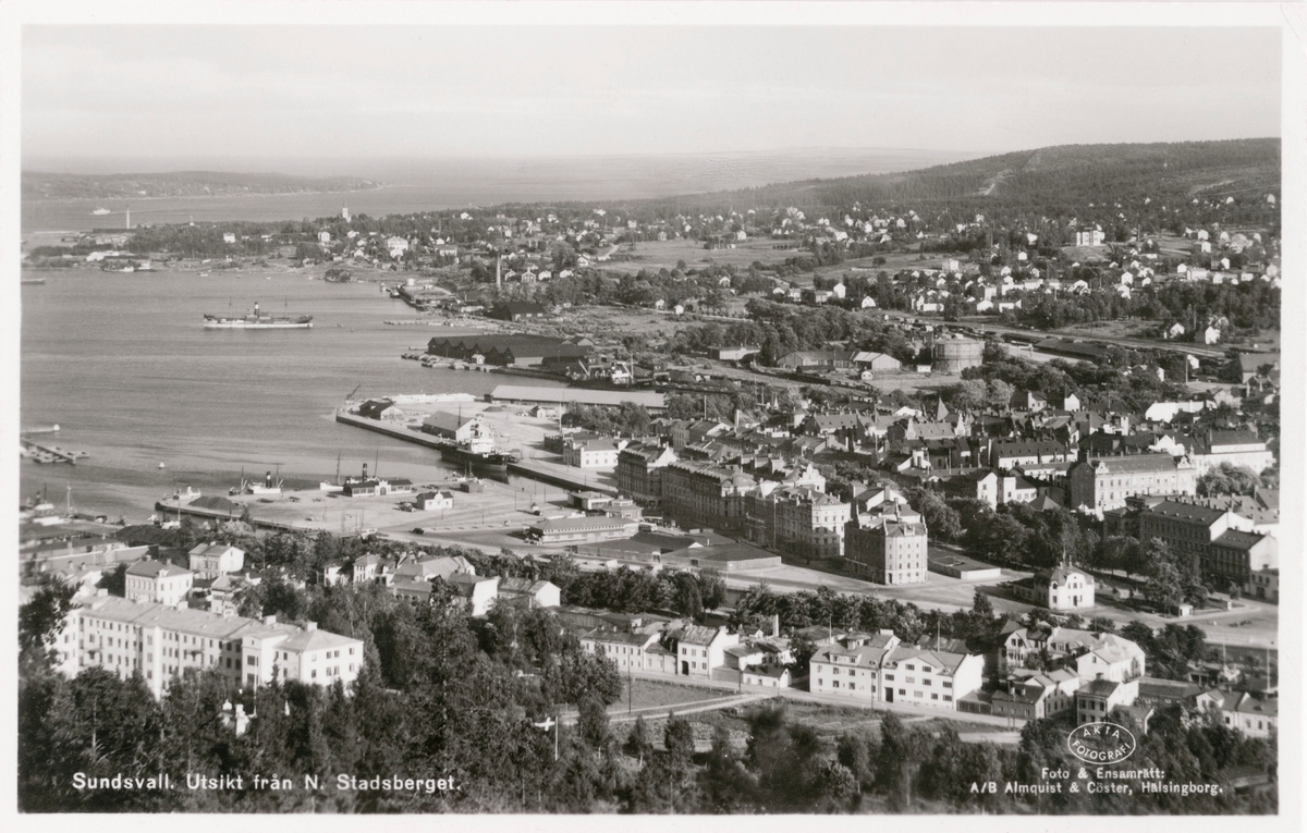 Vy över hamninloppet. Text på vykortet "Sundsvall. Utsikt från N. Stadsberget."