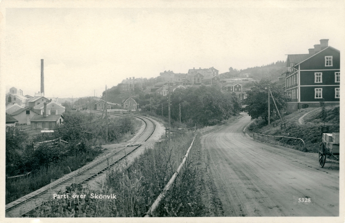 Parti över Skönvik. Vy med arbetarbostäderna, sågverket samt järnvägen. Vykort.