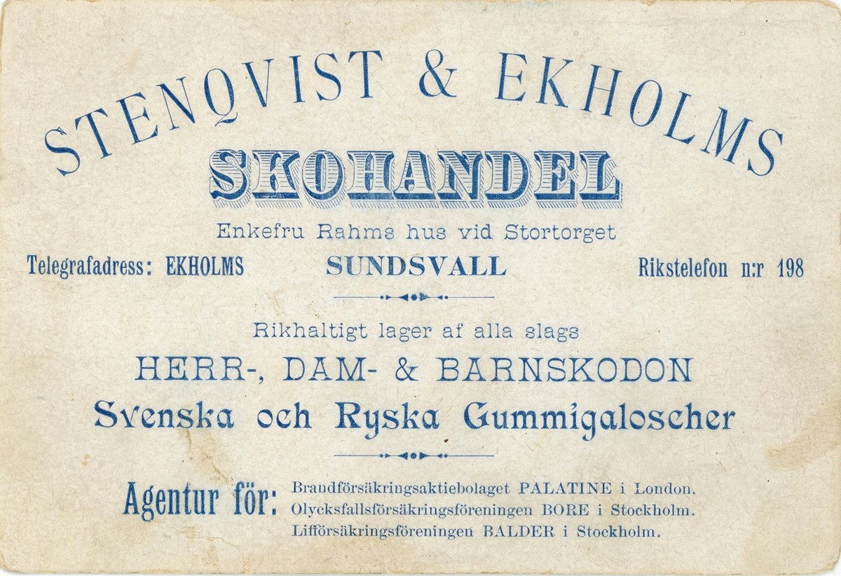 Reklamtryck (kort 8x12) för Stenqvist & Ekholms skoaffär. Storgatan 24, i Rahmska huset. Anrik skoaffär som startade sin verksamhet 1879. Föregångare till SkoRing. Flyttade senare till Storgatan 22 i Kihlmanska huset.