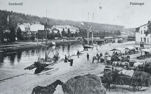 Från vänster Norrmalm, Selångersån och till höger torghandel på Fisktorget. I Selångersån ligger båtar och segelfartyg. Vykort. J. Sunessons Bokhandel förlag.