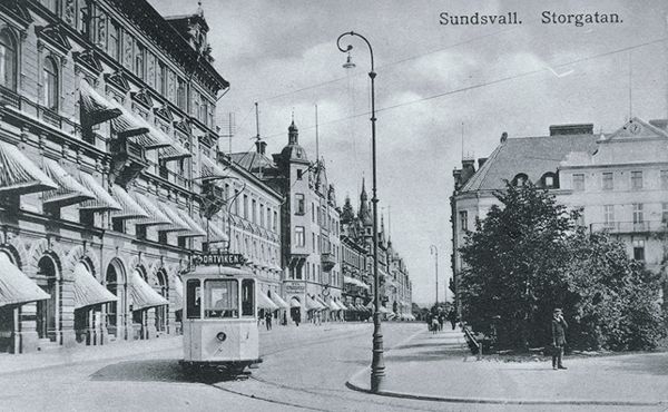 Spårvagnstrafiken pågick mellan 1910-1952 i Sundsvall. Vykort.
