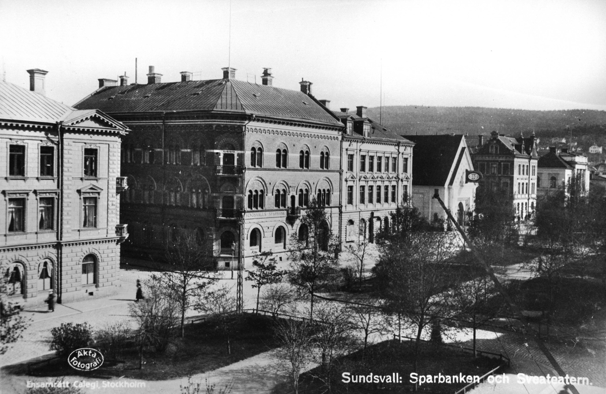 Vy mot kv Vesta och kv Mars vid Östra Esplanadgatan. I kv Vesta till vänster ses biografen Olympia, och i kv Mars ses Svea-Teaterns utstickande skylt med texten "BIO" på fasaden. Vykort.