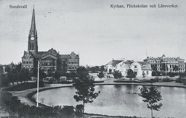 Till vänster kyrkan och framför Flickskolan och till höger Läroverket. I förgrunden Bunsowska tjärn och villabebyggelse. Vykort.