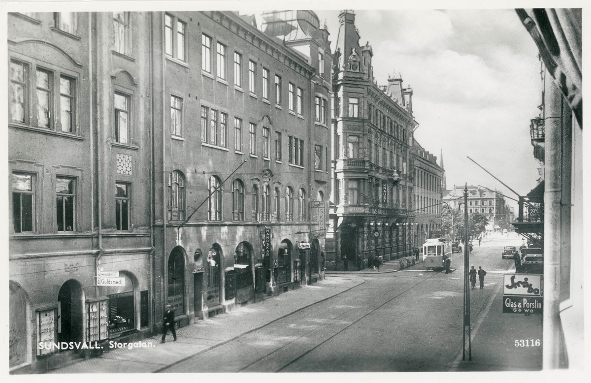 Vy över Storgatan från öster. Från vänster kv Venus 2-1. Skyltar med "RINGAR" Wahlbergs Guldsmed", samt "HANDSKAR" därefter "Tynnes leksaker" och "Ingeborg Engelbrekt SKOR". Kv Proserpina 1-4 med hotell KNAUST. Närmast till höger kv Minerva med skylt "Småbo GeWe Glas & Porslin". Spårvagn ses köra i gatans riktning.
