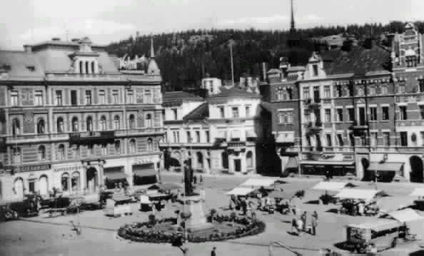 Stora Torget med torghandel och Gustav Adolfstatyn i förgrunden, till vänster Hirschska huset (kv Nyttan) och till höger Holmströmska huset (kv Hälsan). Text på vykortet "Sundsvall. Torget".