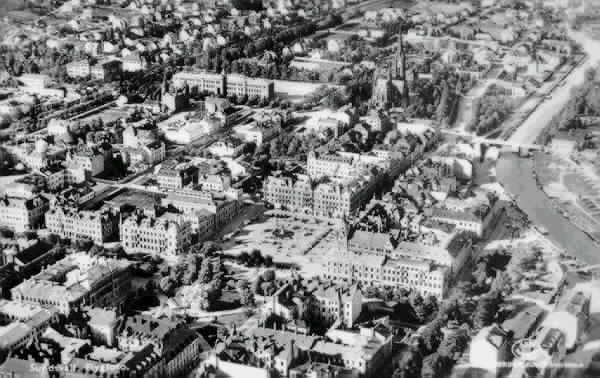 Från vänster förgrund bebyggelsen runt parken Vängåvan, kv Proserpina, kv Pan,kv Olympen. Bebyggelsen runt Stora torget från vänster kv Rätten, kv Stadshuset kv Nyttan (Hirschska huset), kv Hälsan, kv Försöket. I bakgrunden längs Skolhusallèn Gustav Adolfsskolan, Hedbergska skolan och Gustav Adolfskyrkan. Till höger Selångersån och Storbron. Text på vykortet "Sundsvall. Flygfoto. Troligen sent 1930-tal.