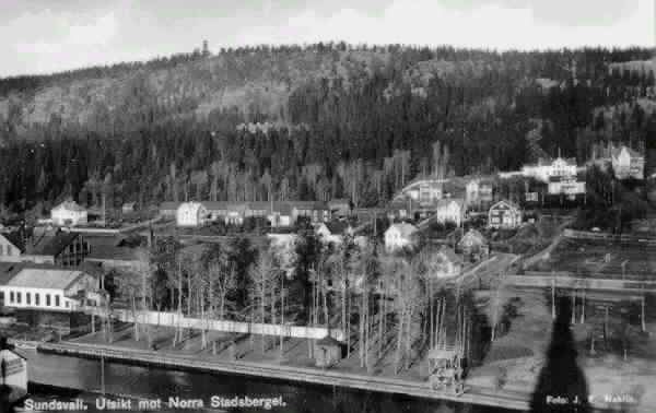 Vy över Stadsbacken och Norra Stadsberget i förgrunden Selångersån, till höger idrottsplatsen och hopptornet och på berget utsiktstorn. Text till bild "Sundsvall. Utsikt mot Norra Stadsberget."