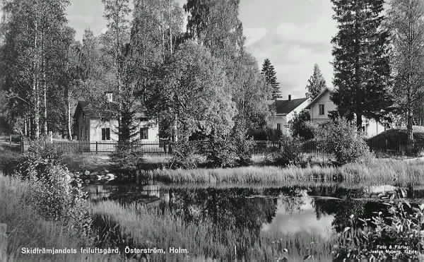 Skidfrämjandets friluftsgård, Österström, Holm. Nu (1987) i kommunens ägo. SCA äger skogarna runtomkring. Naturstig. Vykort.