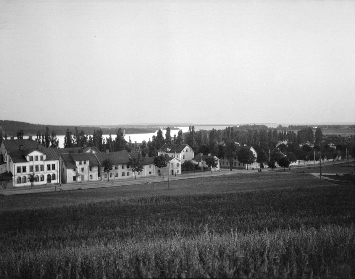 Parti av Motala med husraden utmed Drottninggatan, i stora drag mellan Repslagaregatan-Storgatan. De bägge husen till vänster kvarstår ännu. Odaterad bild från 1900-talets första del.
