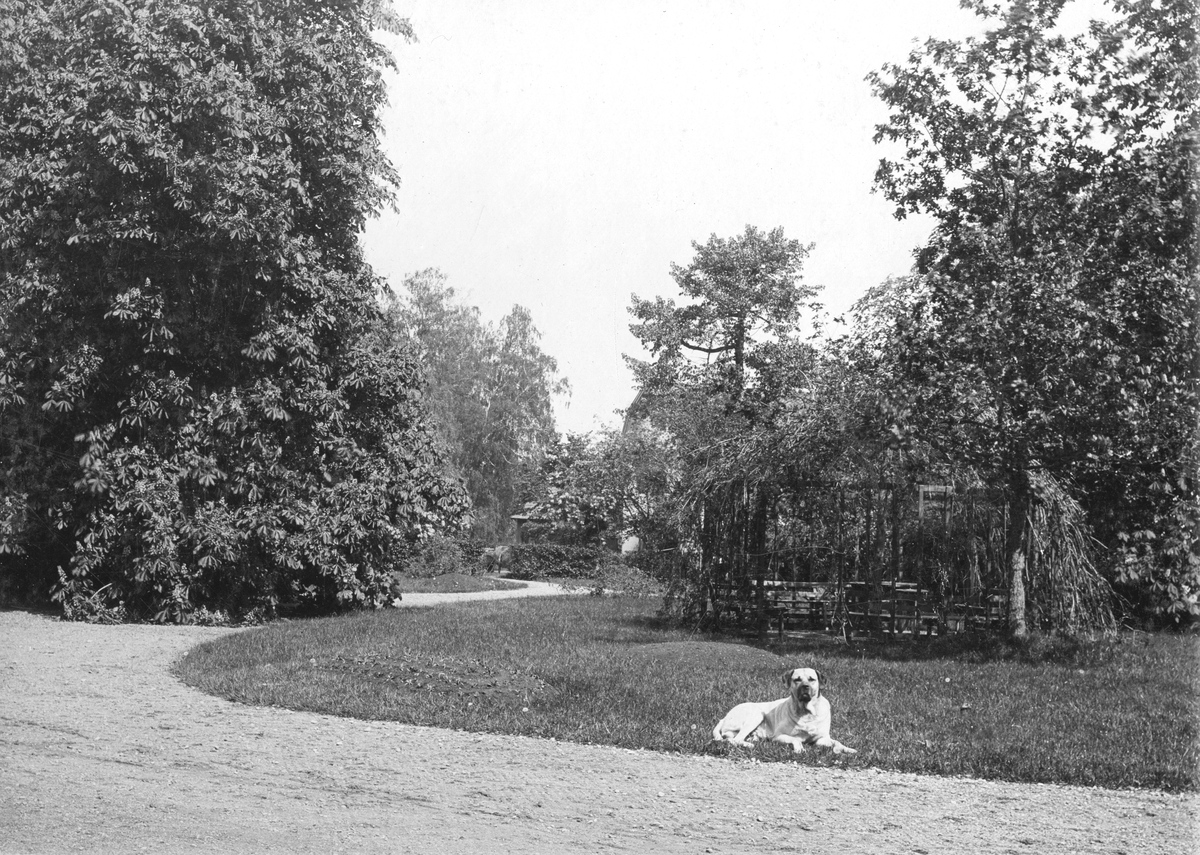 Motiv från parken till Solberga gård i Veta socken. Bild från omkring förra sekelskiftet, i en tid då gården ägdes av makarna Dankwardt-Lillieström. Vad deras hund hette är oss inte känt.