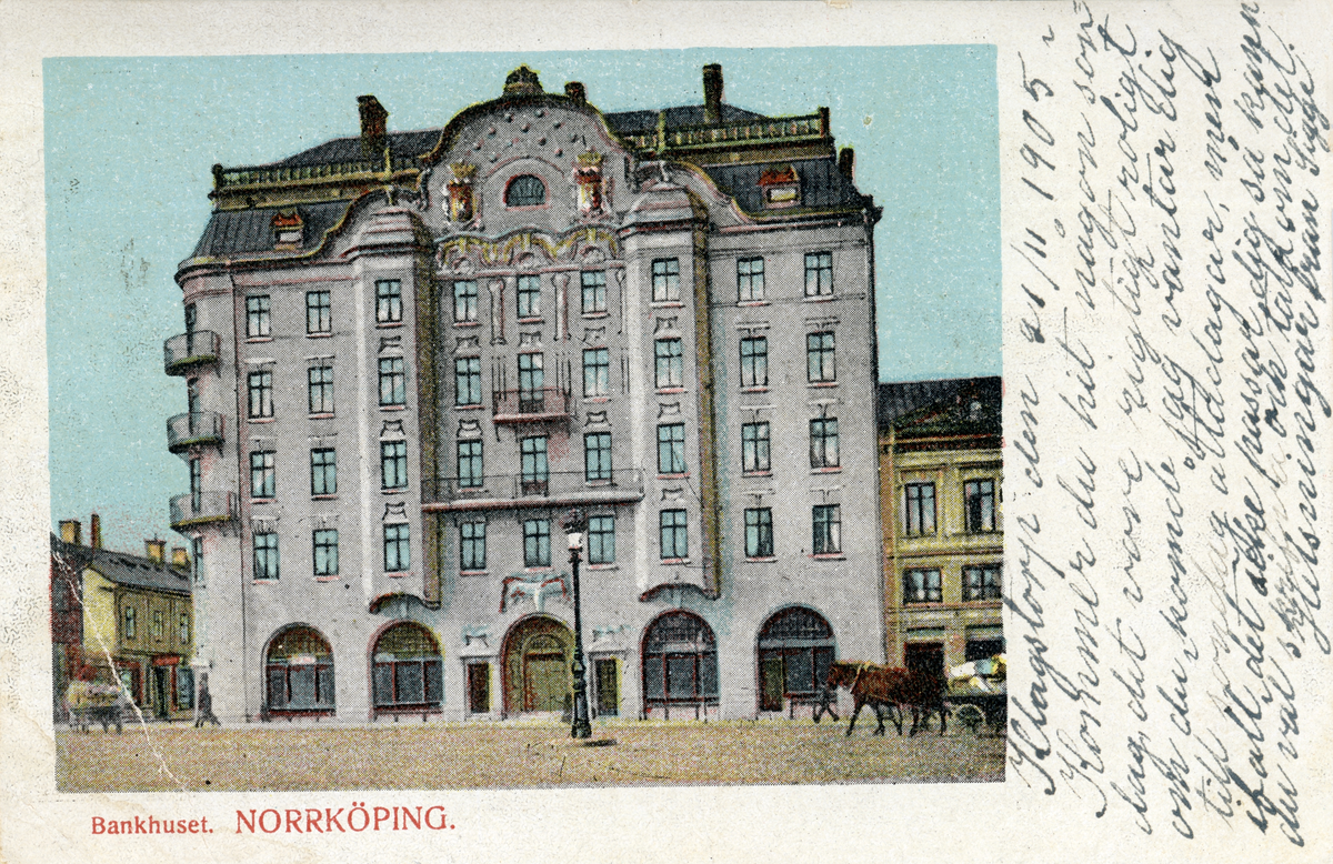 Alldeles i inledningen av förra seklet stod Norrköpings enskilda banks solida bankhus utmed Drottninggatan klart. Här resultatet genom ett kolorerat brevkort avsänt 1905.
