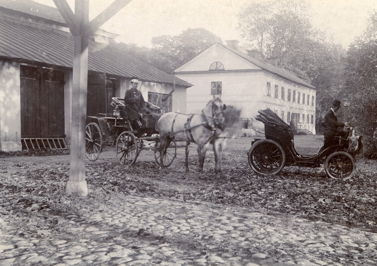 Nött men unikt fotografi från Tullgarn omkring förra sekelskiftet. Bilen, en Peugeot modell 28, inköptes år 1900 av kronprins Gustaf för sina resor mellan Stockholm och kungsgården Tullgarn som han vid tiden disponerade. Bilens förare har av John Nerén (förf. Automobilens historia) antagits vara verkmästare G Behmer alternativt Brehmer men har för denna uppgift inte närmare identifierats. Kusken får antas vara Klas Robert Thorell som denna tid var anställd vid Tullgarn. Byggnaden i bakgrunden är Tullgarns värdshus.