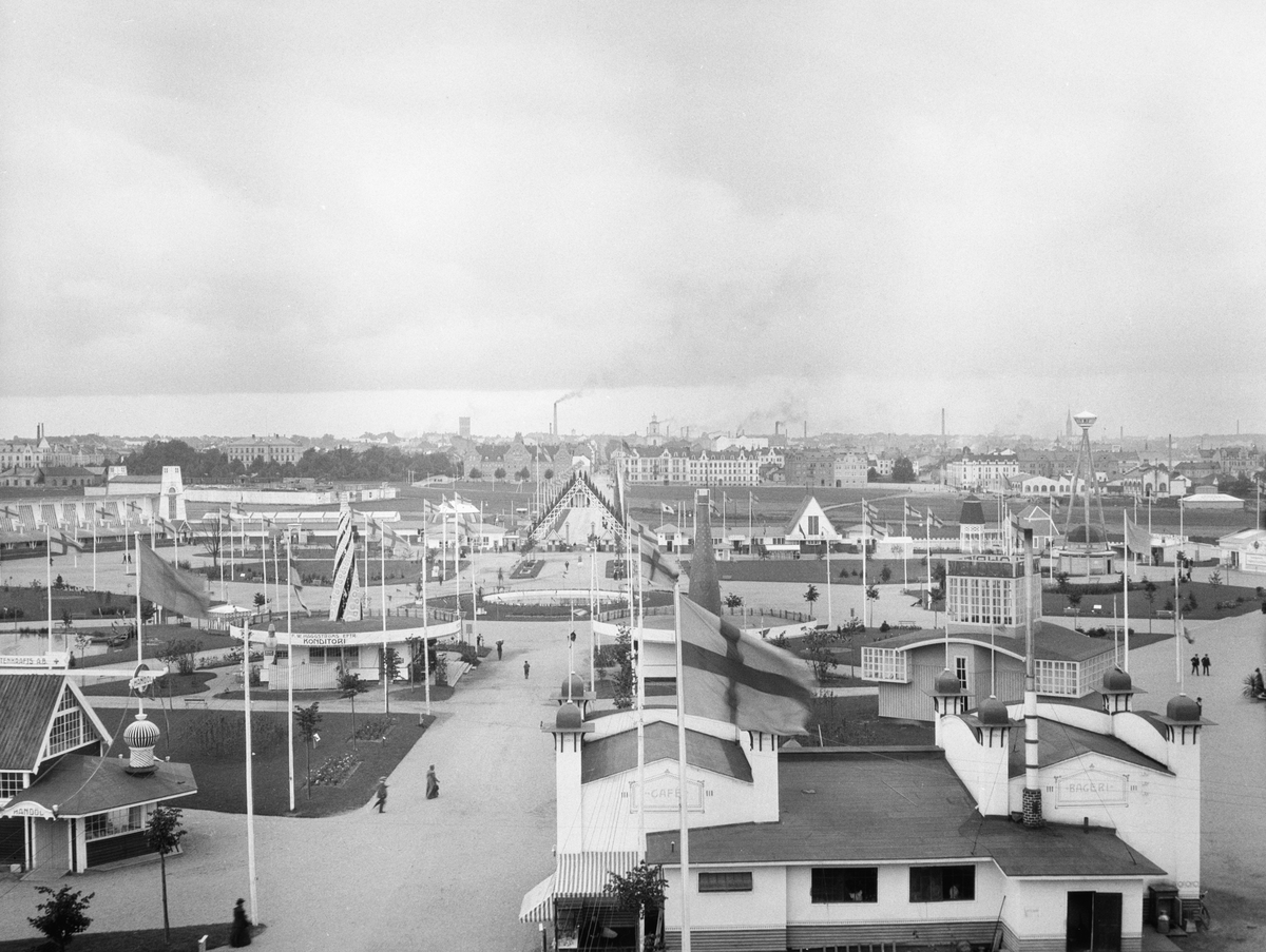 Vy ut över utställningsområdet vid Konst- och industriutställningen i Norrköping 1906. Vid industridelen kunde en mångfald enskilda utställare visade vad tidens utveckling kunde åstadkomma och erbjuda. Konstpaviljongerna förevisade över 900 konstverk av landets mest namnkunniga konstnärer.