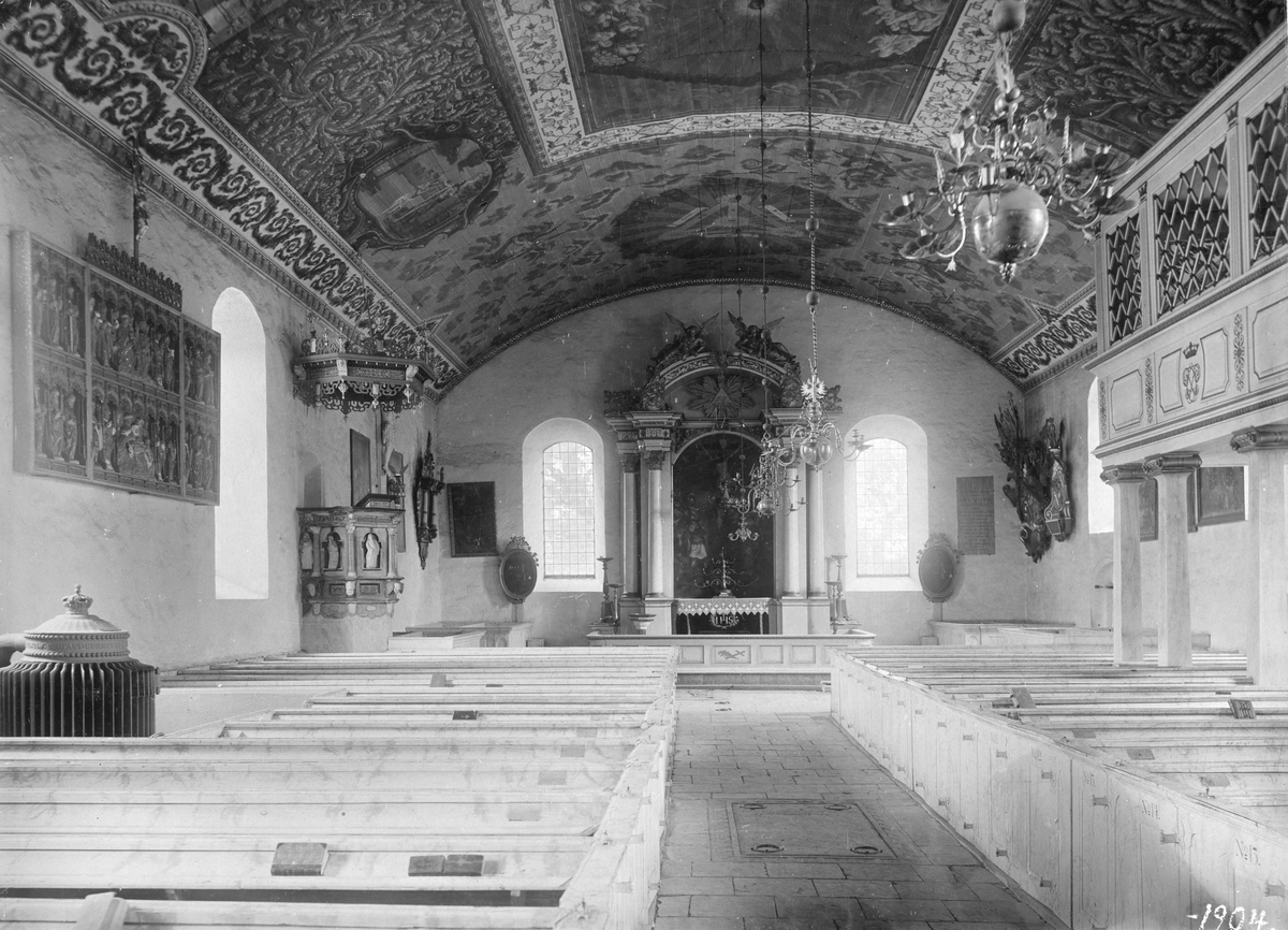 Interiör av Vist kyrka 1904. I det närmaste allt i bilden kom olyckligtvis att bokstavligen gå upp i rök vid en eldsvåda 1961. Kyrkan stod klar 1745 och ersatte då en äldre helgedom som kunnat härledas till åtminstone 1100-talets slut. 1700-talskyrkan fick en mycket påkostad inredning med målningar av Sven Gustavsson Stoltz från Vadstena. Bland inventarierna under det vackert bemålade taket ses närmast till vänster det senmedeltida altarskåp som enligt uppgift var ett verk av Bendt Notke eller någon av dennes elever. Den unika predikstolen, den enda i landet som sannolikt kunnat knytas till bildhuggaren Börje Eriksson, var utförd 1650 och av samma mästare emanerar dopfunten, som lyckligtvis var en av få inventarier som kunde räddas ur lågorna. Av det förlorade stannar denna redogörelse vid altartavlan som föreställde korsfästelsen och var utförd av konstnären Johan Jerling.