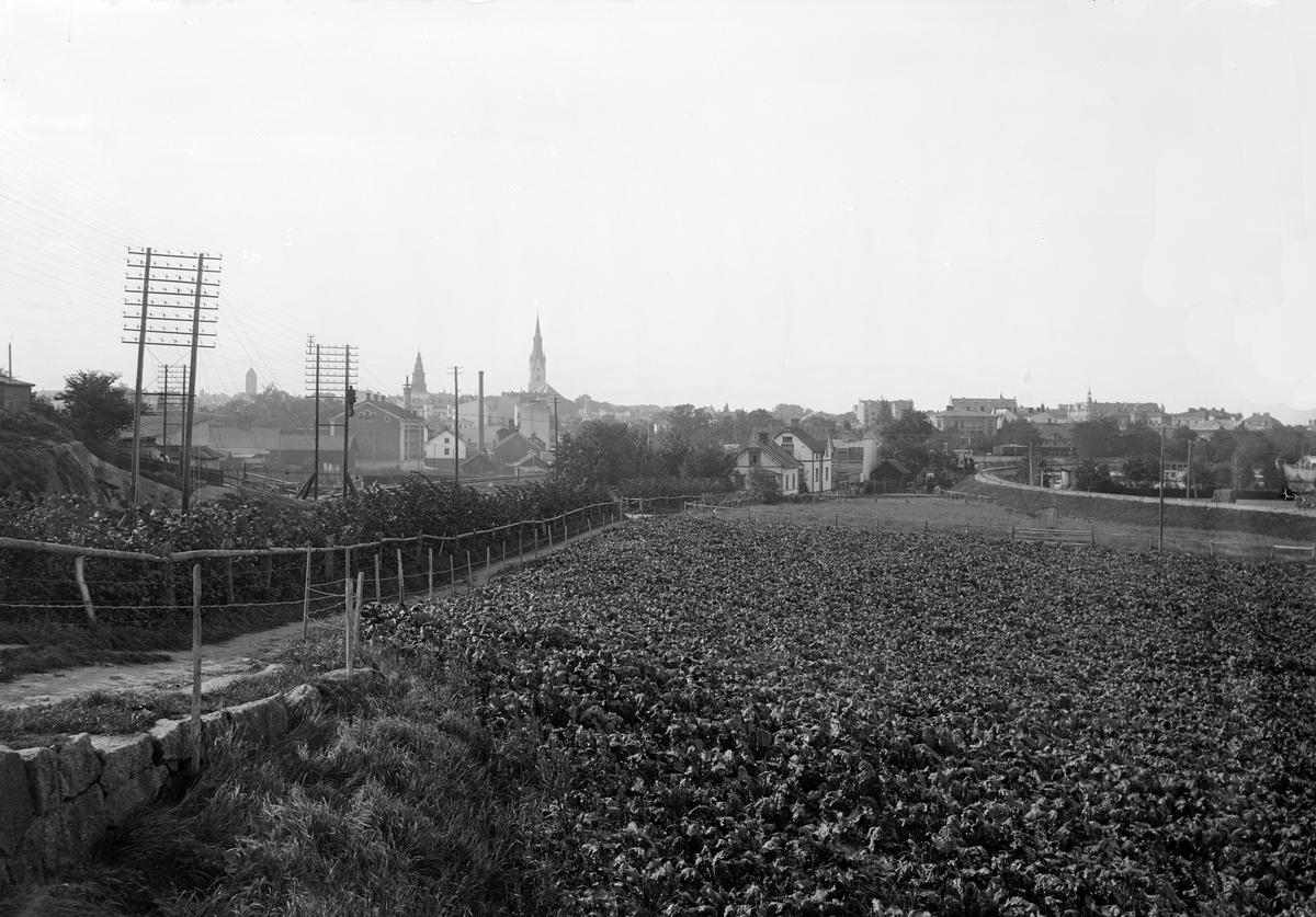 En från äldre tid sparsamt förekommande vy mot Linköping. Fotograf Didrik von Essen hade för denna tagning placerat sig på den så kallade Landshövdingejorden i Kallerstad och riktat kameran rakt västrut. Bilden är odaterad men kan preciseras till 1913.