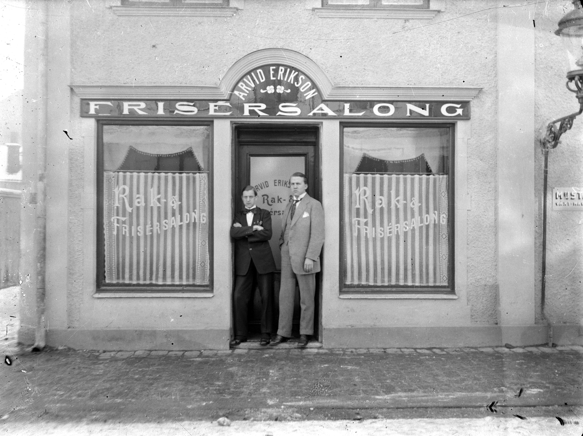 Medfaret fotografi mot Arvid Erikssons frisérsalong i Linköping. Rörelsen startades 1911 av nämnda Eriksson och hans salong låg på adressen Storgatan 18 i nuvarande kvarteret Decimalen. Här ser vi honom tillsammans med en icke identifierad yrkesbroder. Tiden är omkring 1920.