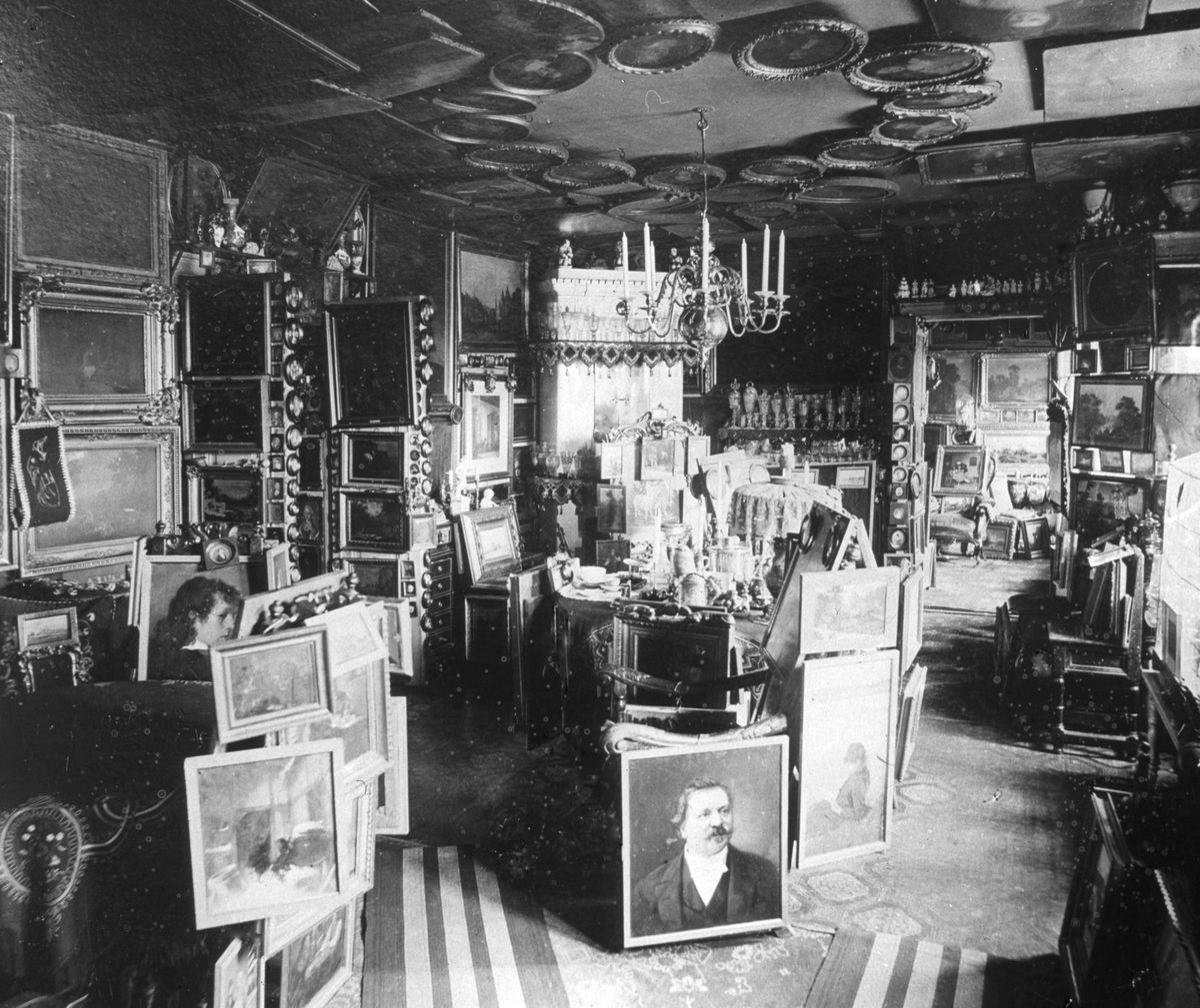 Interiör från och samlaren Carl Dahlgrens hem, som synes till bristningsgränsen fylld av konstföremål. Vid sidan av gångstråk var endast takytan runt ljuskronan fri. Bilden är odaterad men sannolikt tillkommen kort efter Dahlgrens död 1894 och i samband med hämtningen av hans stora donation till främst Östergötlands museum.