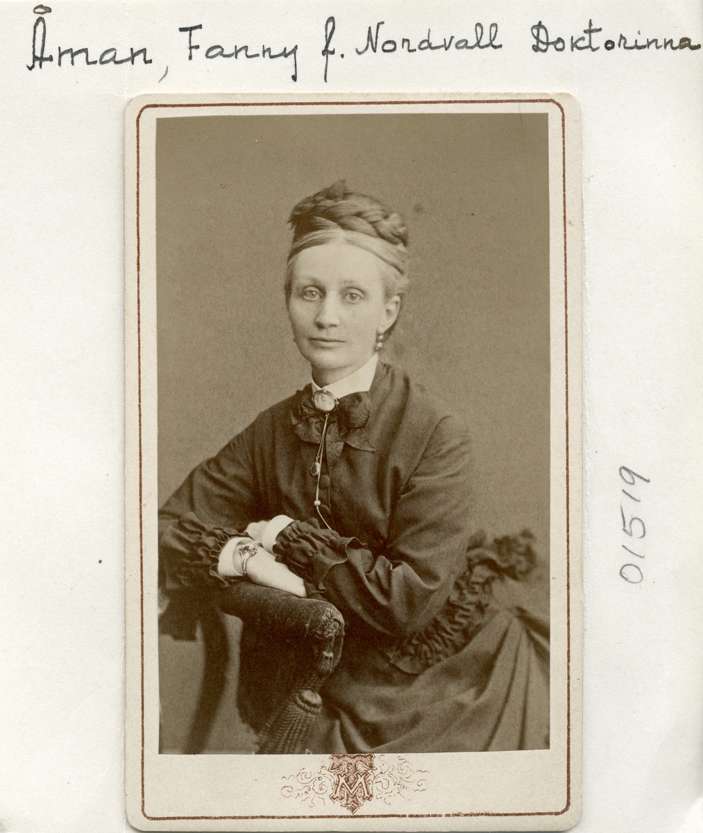 Porträtt av Fanny Åman, eller egentligen Fanny Nordvall, då hon enligt tidens namnskick, såvida hon inte blev änka, rimligtvis lystrade till sitt flicknamn livet genom. Just änka kom hon längre fram att bli, även om tiden dit ännu var lång när fotografiet togs. Bilden är odaterad men hennes typiskt, konstfylla håruppsättning ger oss osvikligt något av 1870-talets år. Det påtalade äktenskapet hade inletts 1856 och gällde lasarettsläkaren Ludvig Åman. Tillsammans fick paret fyra barn som alla nådde vuxen ålder. Familjen var bosatt i tjänstebostaden till länslasarettet i Linköping, där maken var verksam. Efter makens död kom Fanny att flytta till egen våning på Platensgatan 7 och i slutet av sitt långa liv till ett då nyligen uppfört bostadshus i Vasastaden.