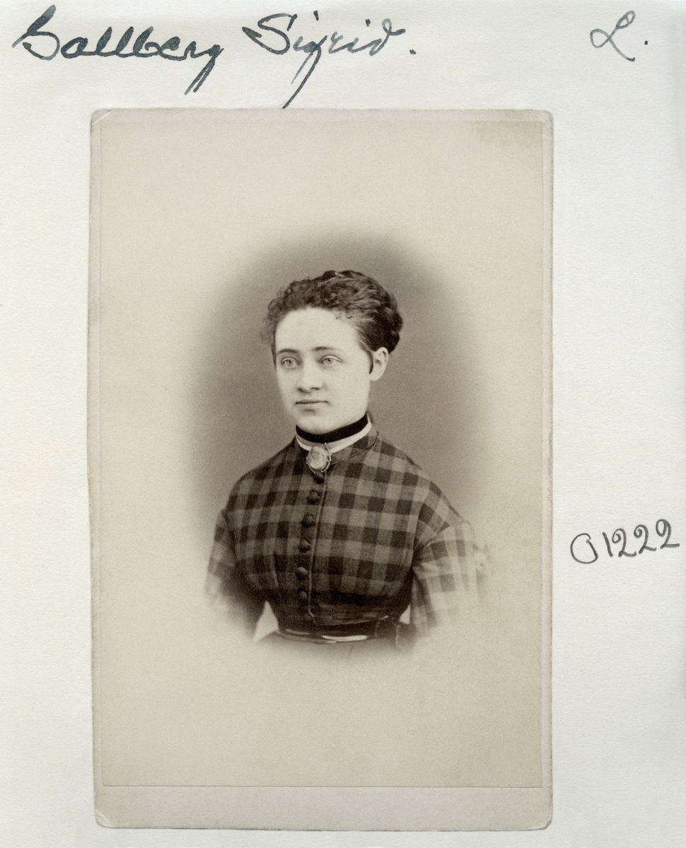 Enligt påskrift porträtt av Sigrid Märta Christina Sallberg. Född 1847 i Åtvidaberg som dotter till Kapten Gustaf Magnus Sallberg och Christina Katarina Lundberg. Efter föräldrarnas död uppfostrades hon och hennes syskon av deras faster Carolina Fredrika Strömmenberg f. Sallberg och farmodern Carolina Fredrika Sallberg f. Gyllenram. Gift 1875 med fabrikör Karl Edvard Liedberg. Avled i Limhamn, Malmö den 9 december 1938.