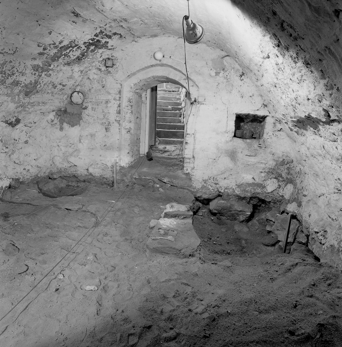En exklusiv insyn under källarvalven i ett av Linköpings få återstående byggnader från medeltiden. Stenhusgården på Storgatan uppfördes ursprungligen som så kallat prebende, en residensgård knuten till domkapitlet. Över tid kom byggnaden att inrymma olika verksamheter, diverseaffär och kafé är två exempel. Bilden är tagen i samband med en genomgripande restaurering 1965. Efter färdigställande fick byggnaden ny funktion som utställningslokal.