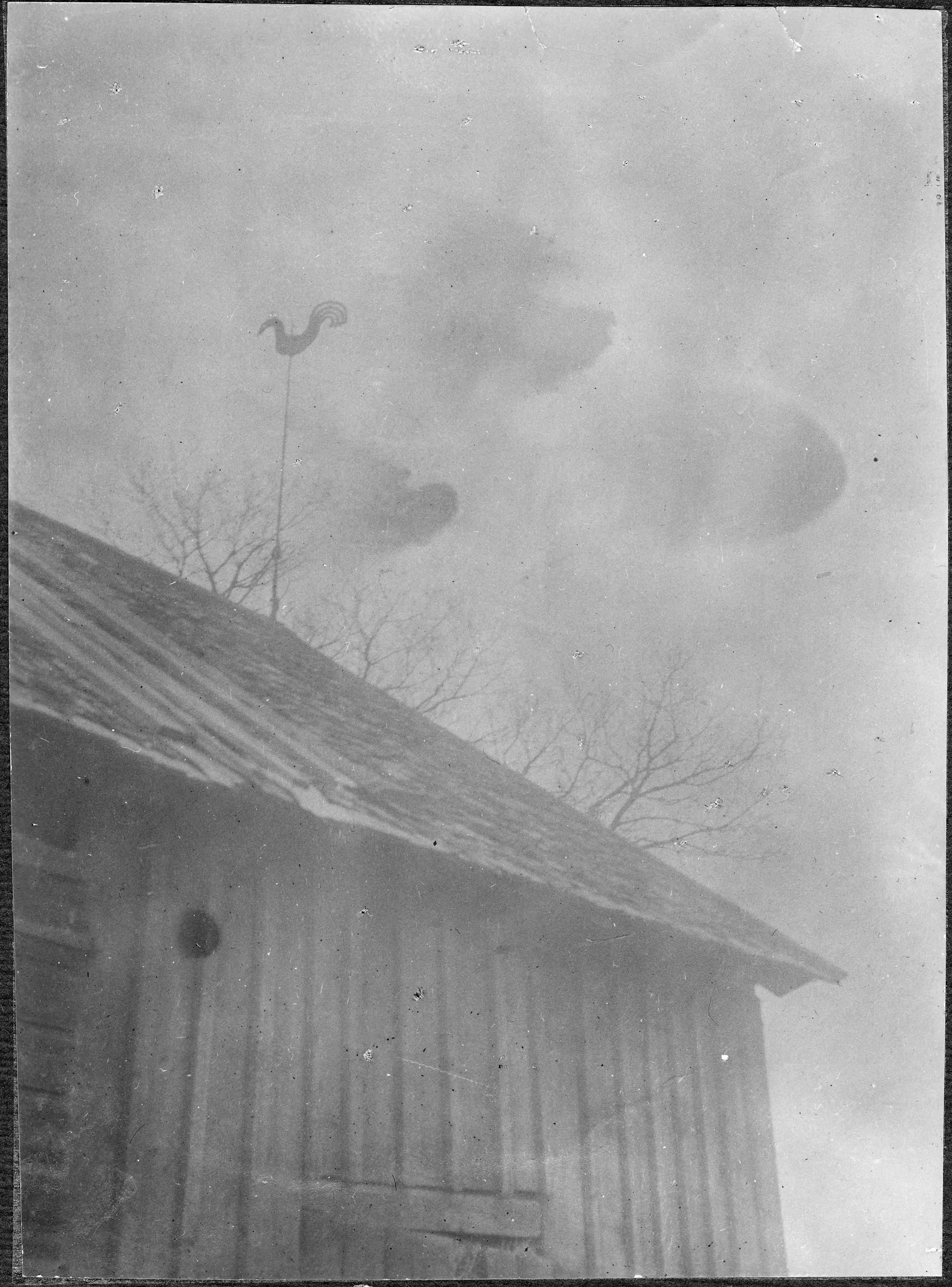 Kyrktupp, från rivna kyrkan, uppsatt på vedbod.