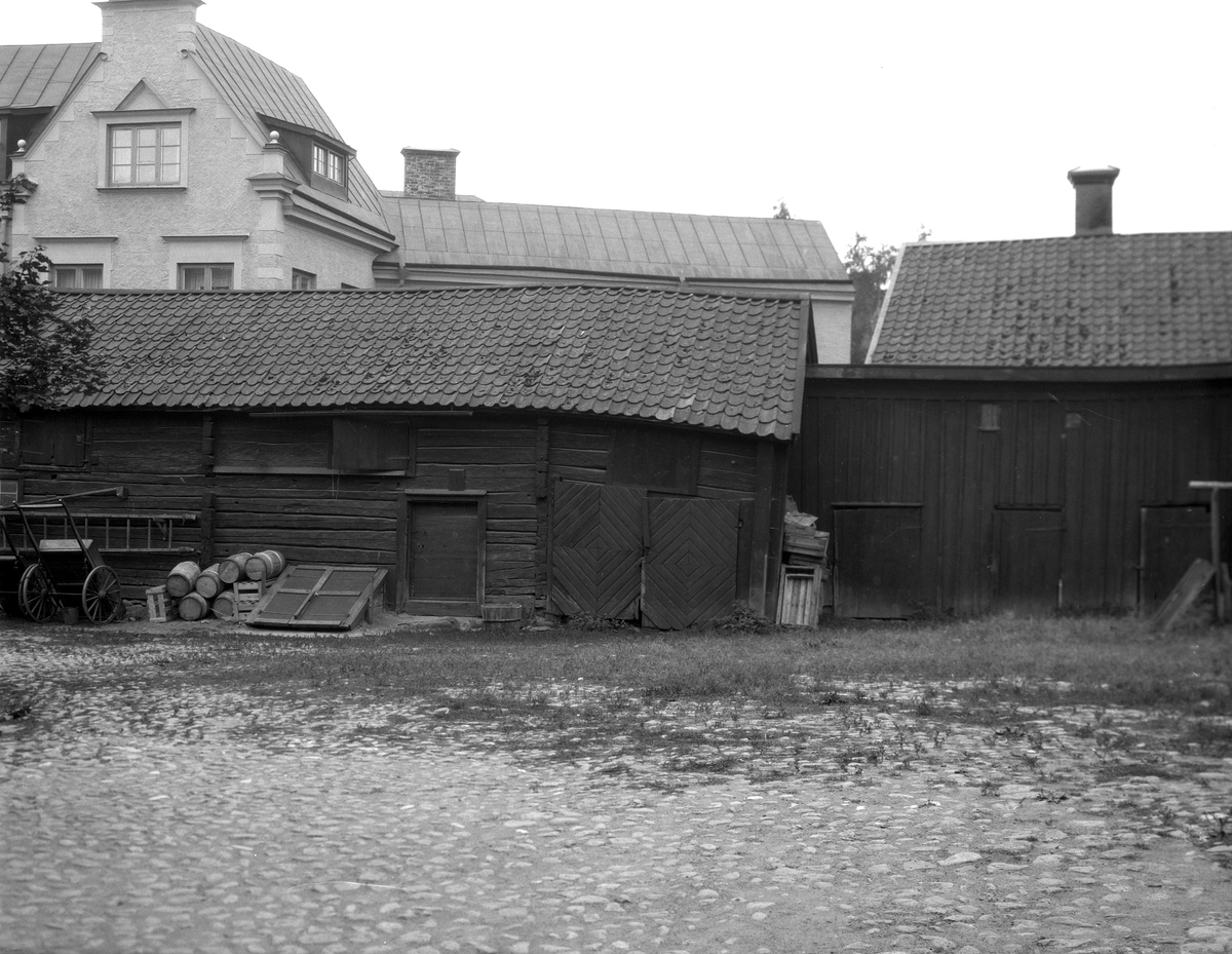 Linköping 1929 genom ett motiv som exakt kan lokaliseras tack vare baptistsamfundets fastighet i bakgrunden. Trälängan låg utmed Stora Badtugatan men tillhörde den gård som ännu under bildens skede kunde benämnas mamsell Dufvas gård med huvudbyggnad mot Nygatan. Vy mot söder.