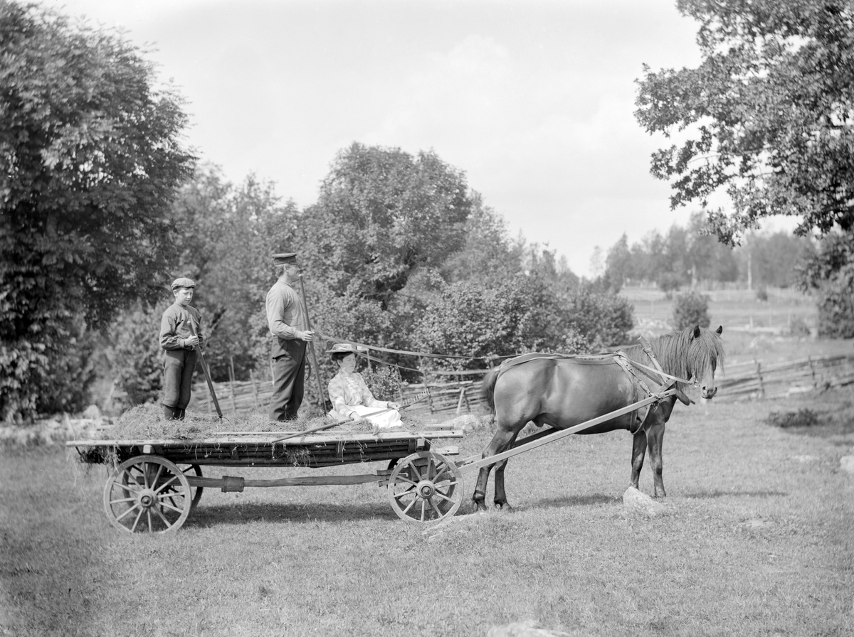 David Liedbergius med hustrun Cecilia och hennes bror Fritiof Andersson i vad som synes vara lättsamt skördearbete. Makarna är nygifta och äger sedan helt nyligen ett hemman i byn Flodlycke. Innan året är slut kommer deras första barn till världen.