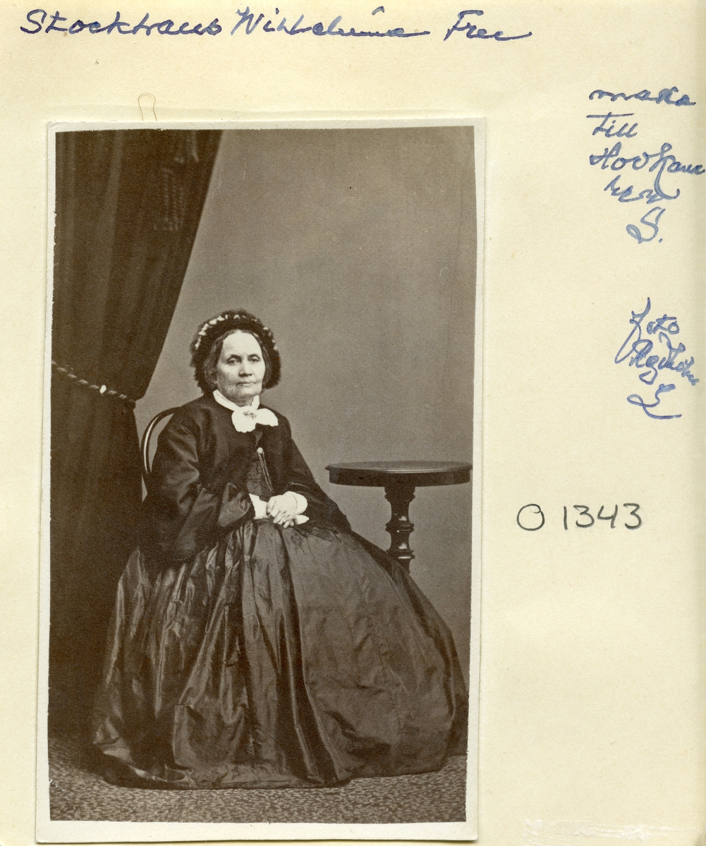 Porträtt av fru Wilhelmina Göhle. Här ser vi henne något till åldern kommen i linköpingsfotografen Svante Leonard Rydholms ateljé. Hon är sedan 1832 gift med hovkamrerare Gustaf Adolf Stockhaus och makarna äger och bor på Malma säteri i Ydre.