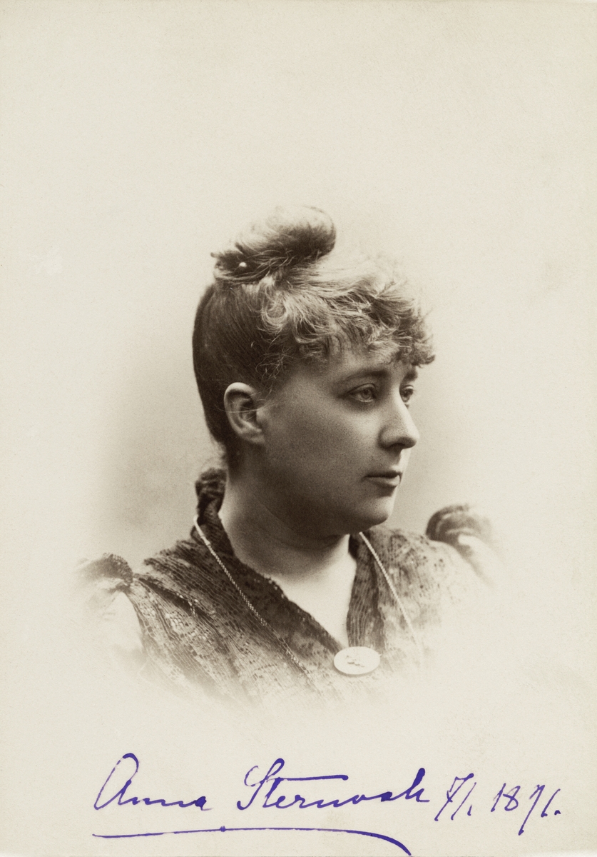 Porträtt av skådespelaren Anna Byström, gift med kollegan Oskar Sternvall under åren 1883-1903. Dotter till tonsättaren Oscar Byström och dennes maka Elisabeth Dorotea Augusta, född Bäckström i Linköping. Utbildad sångerska, bland annat i Sankt Petersburg, övergav hon planerna på en sångkarriär för att istället övergå till teatern. Från 1877 var hon knuten till några av Sveriges största teatrar.
