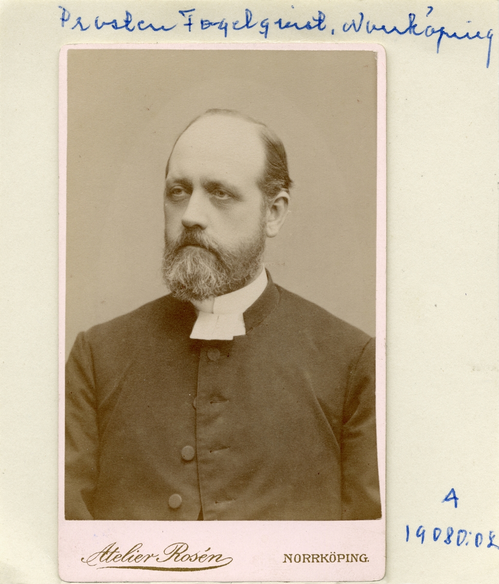 Porträtt av Johan Peter Fogelqvist. Bördig från Västergötland. Utnämnd till kyrkoherde i Hedvigs församling 1881. Dessförinnan gift med Beda Wilhelmina Salvén (1843-1878) och efter makans död omgift med hennes syster Teodolina Corona Salvén (1844-1891). Kyrkoherde Fogelqvist kom att hinna med ett tredje giftemål, när han 1893 äktade Eva Kristina Malm (1855-1933).
