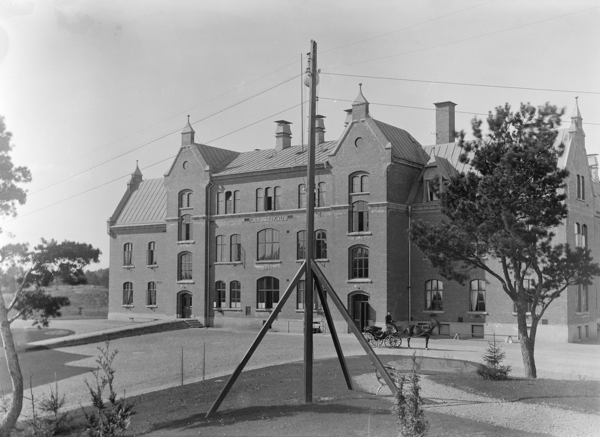 Linköpings länssjukhus nära på invigningsåret 1895. Ritningarna till den nya anläggningen utfördes av Axel Kumlien (1833-1913). Vy mot sydväst.