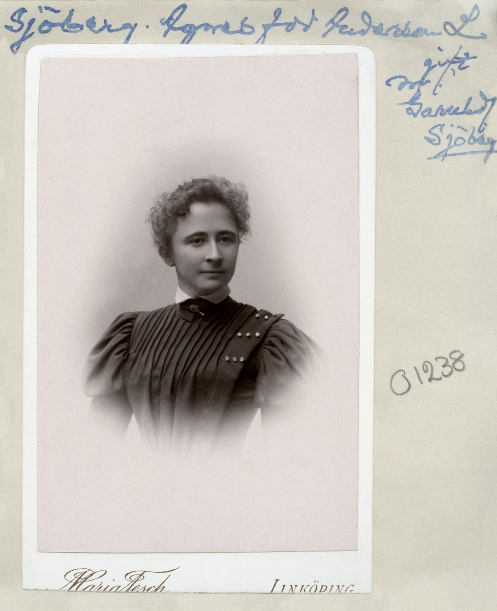 Porträtt av Agnes Sjöberg, född Andersson. Agnes föddes den 23 juli 1872 i Linköping som dotter och enda barnet till bokhållare Frans Adolf Andersson och Amalia Sofia Hübinette. Gift i december månad 1899 med gårdsägare och handlare Fredrik Melker Sjöberg med vilken hon fick sonen Nils Fredrik Åke. Hon blev änka 1909 och tog då enligt församlingsböckerna över som handlare och gårdsägarinna efter maken. Hon avled den 8 januari 1965 i Linköping.