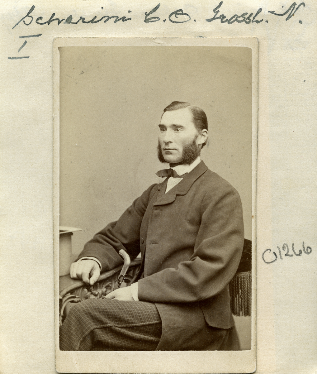 Porträtt av grosshandlare Oscar Scherini. Född i Vånga socken 1824 som son till kyrkoherden Per Scherini och Anna Lovisa Heller. Oscar valde dock en mer värdslig yrkenbana och i källorna hittar vi honom i förstone som handelsbetjänt, inflyttad till Norrköping 1842. Efter några år i lära grundade han en kolonialvaruaffär i staden. Året var 1849 och med tiden kom firma Scherini & Co även att inbegripa de bägge bröderna Alfred och Josef. I början ägnade man sig åt minuthandel, men kom under 1850-talets lopp att bli grosshandlare. I sitt privata förblev Oscar Scherini ogift. Han avled efter ett långt liv den 4 februari 1905.
