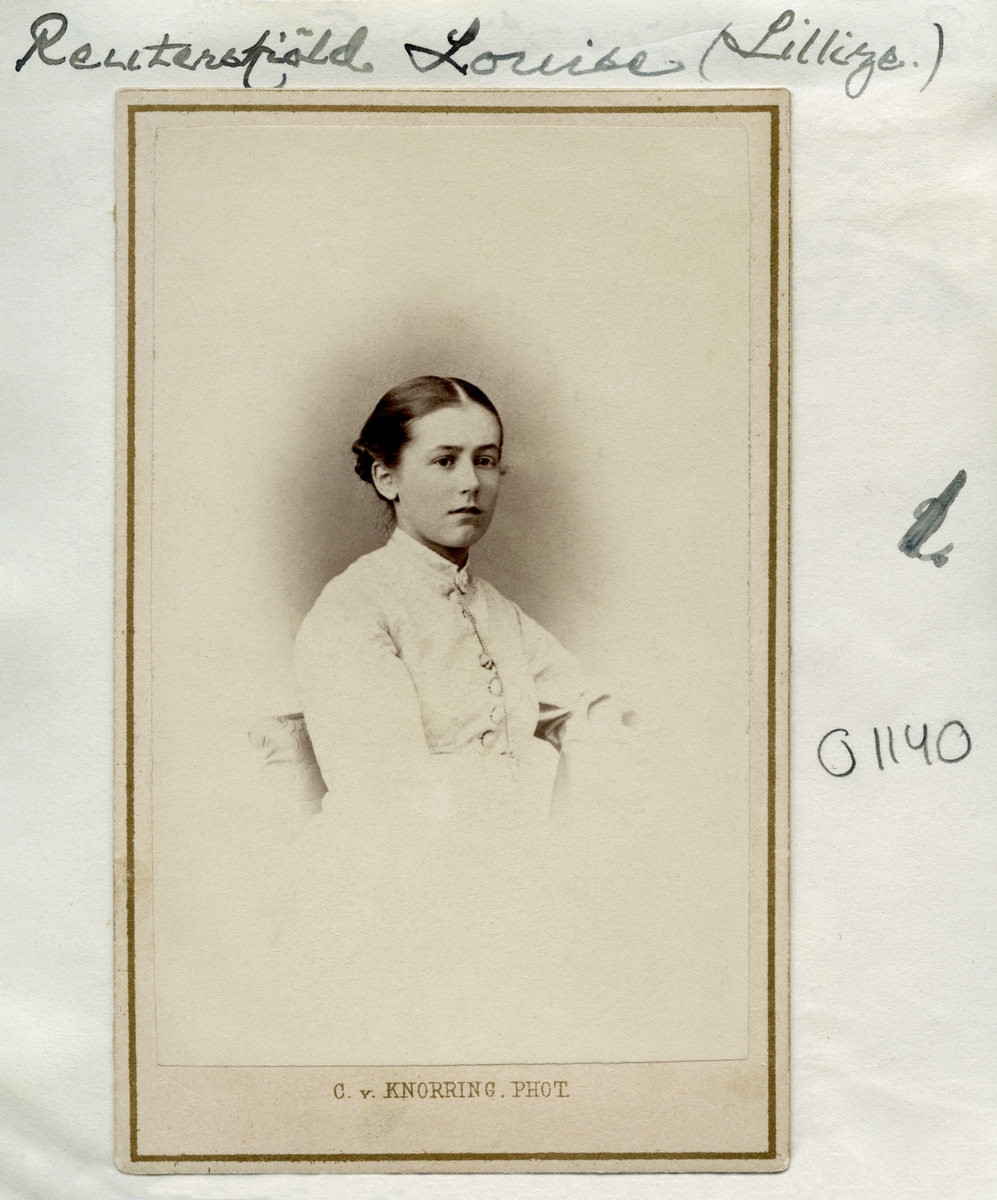 Porträtt av Louise Reuterskiöld, i familjära sammanhang kallad Lizzi. Född 1854 som dotter till kammarherre Adam Didrik Reuterskiöld och grevinnan Charlotta Elisabet Posse vid Ulvåsa slott. Från 1880 gift med Nils Henrik Vult von Steijern och där efter bosatt i Stockholm.