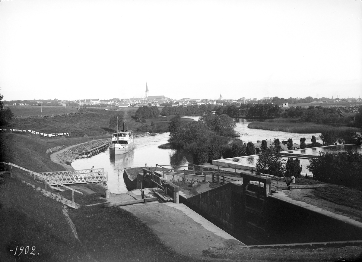 Vy från Tannefors sluss mot Linköping. Mot slussen stävar passagerarfartyget Nya Kinda. Till vänster nyttjar en kvinna kreaturstängslet att torka sin tvätt.