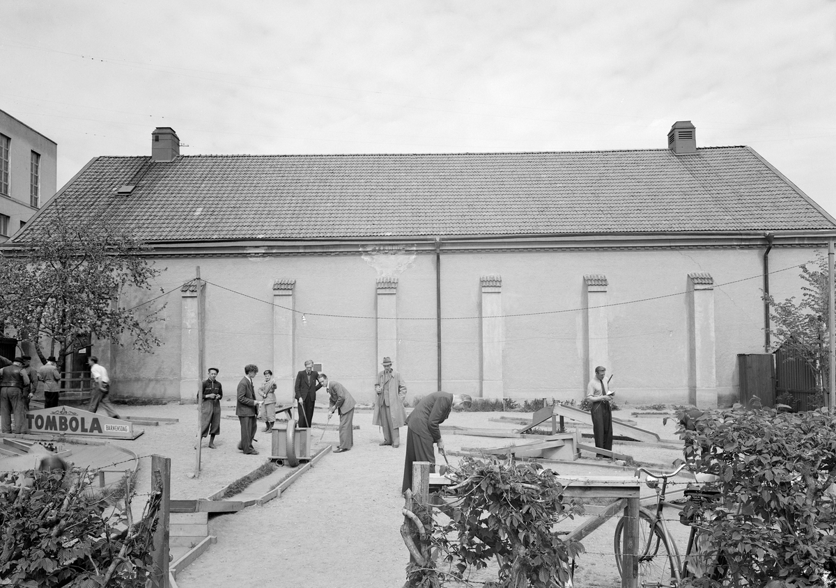 På den fria ytan mellan biografen Grand och Drottninggatan i Linköping kunde man en tid spela minigolf, som synes på fantasifulla banor. Förströelsen hade uppstått i USA på 1920-talet och kommit till Sverige 1931, då en första bana byggdes i Eskilstuna. Nu är året 1944 och det billiga nöjet är redan väl etablerat i landet.