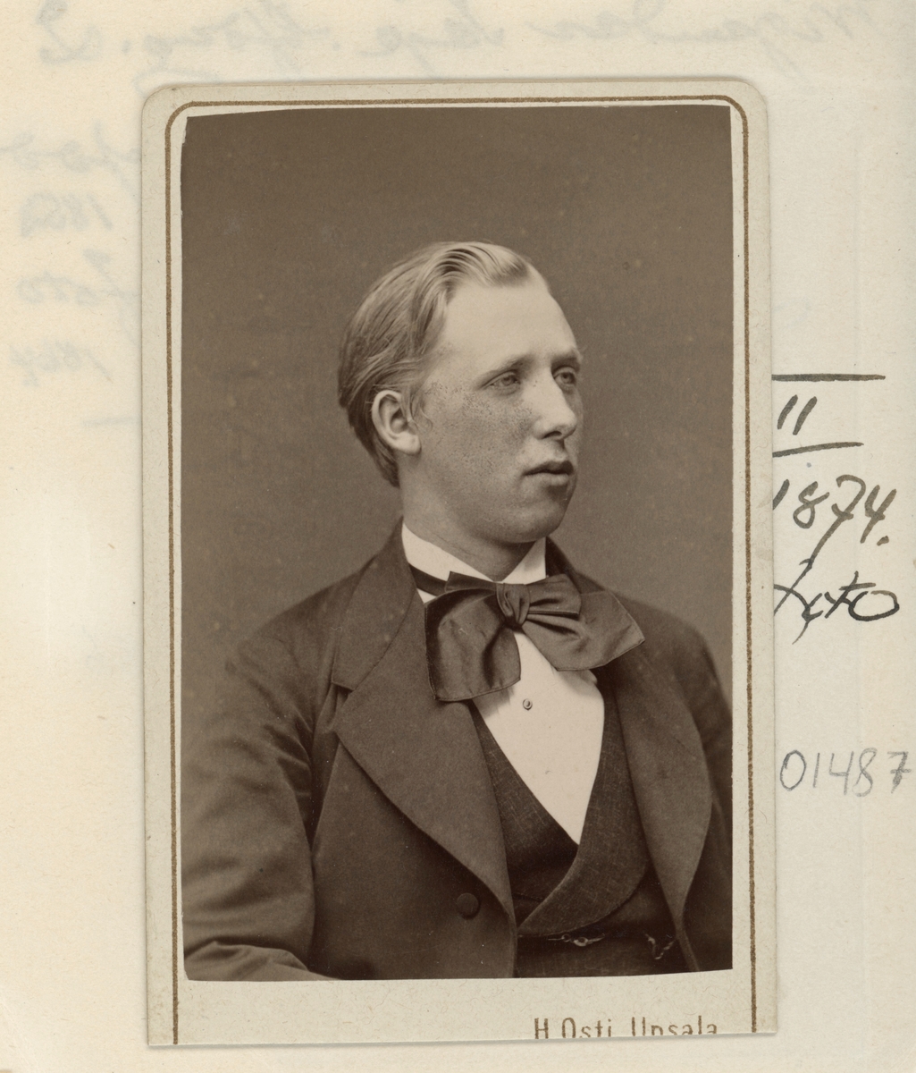 Ungdomsporträtt av Tage Wigander. Född i Linköping 1853 som son till apotekare Anders Fredrik Wigander och dennes hustru Emma Gustafva Godée. Upplysningsvis var det endast Tage av parets sex söner som överlevde barnaåren. I vuxen ålder och efter högre studier i Uppsala kom Tage vidare att få tjänst vid Kammarrätten i Stockholm. Med undantag från en kortare tid i Norrmalm kom han i huvudstaden att vara bosatt på adresser inom Hedvig Eleonora församling. Han avled som ogift 1916.